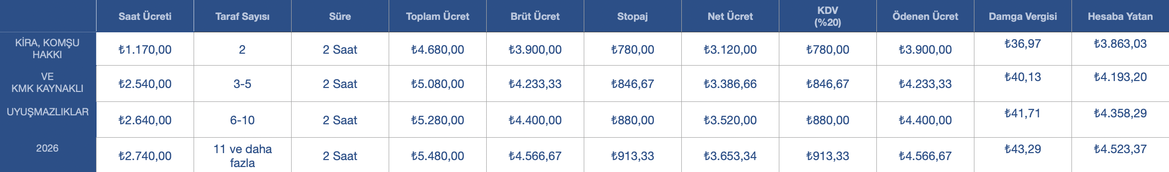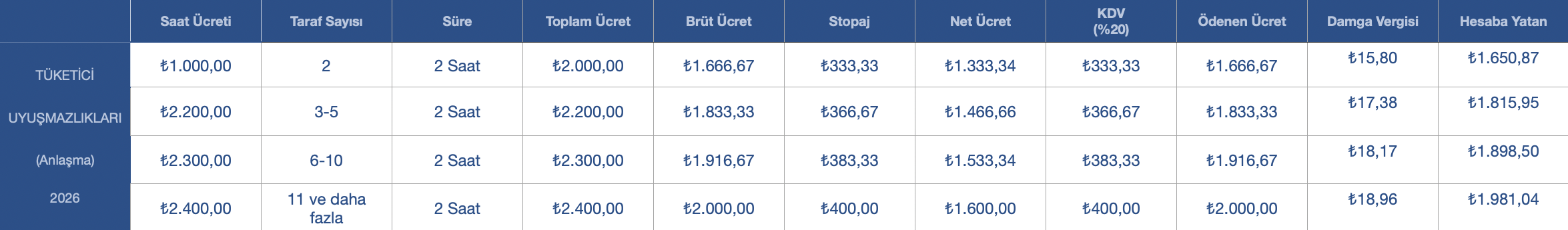 | Ücret Dilimi | Oran | Arabuluculuk Ücreti |
